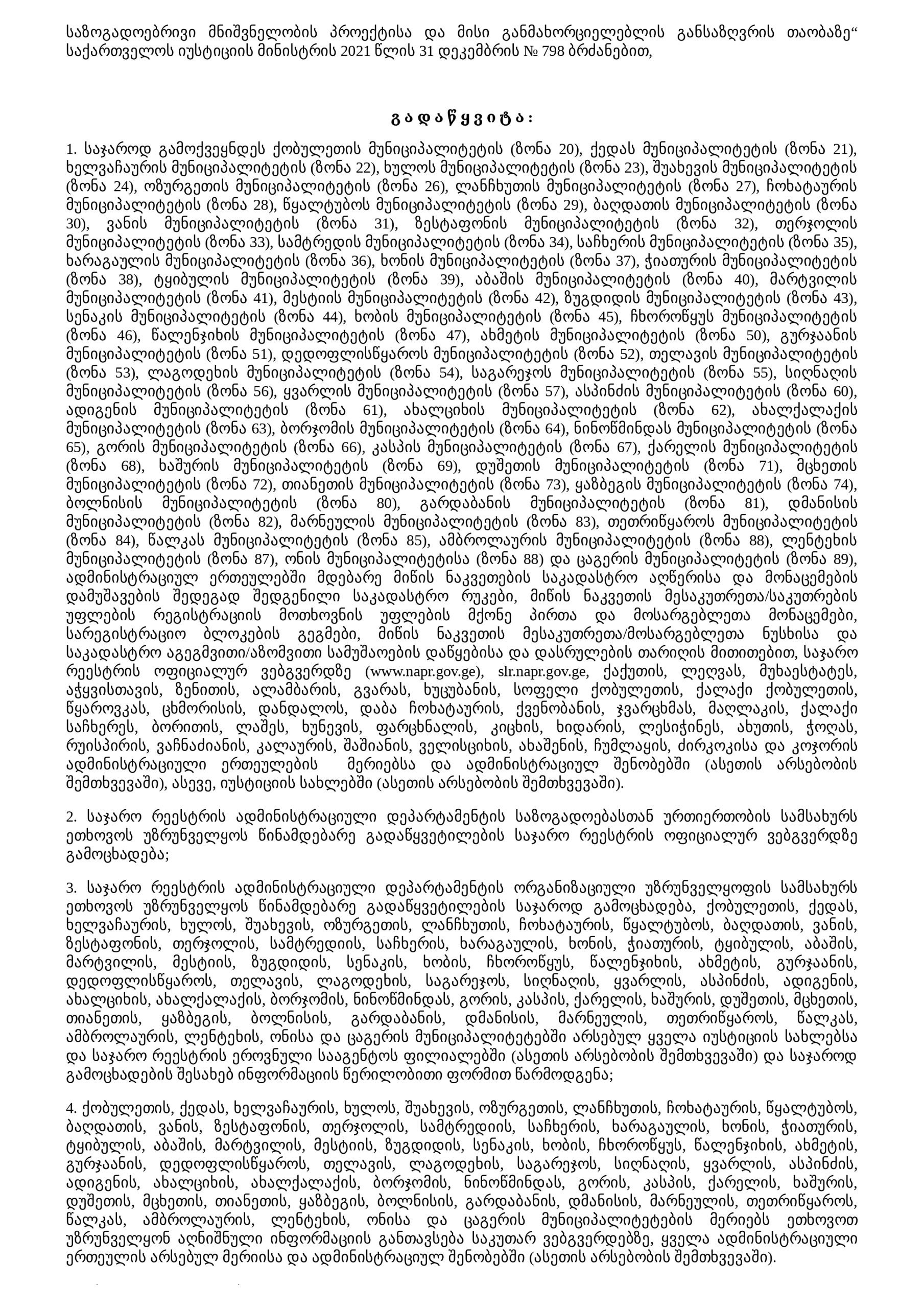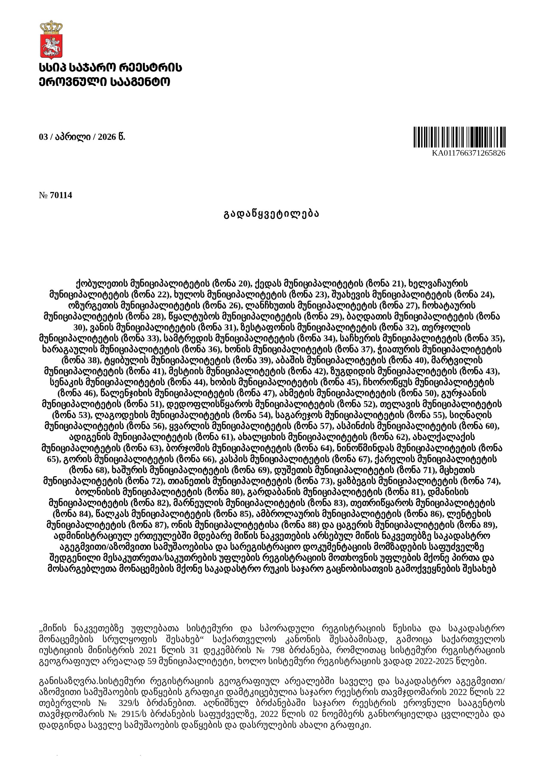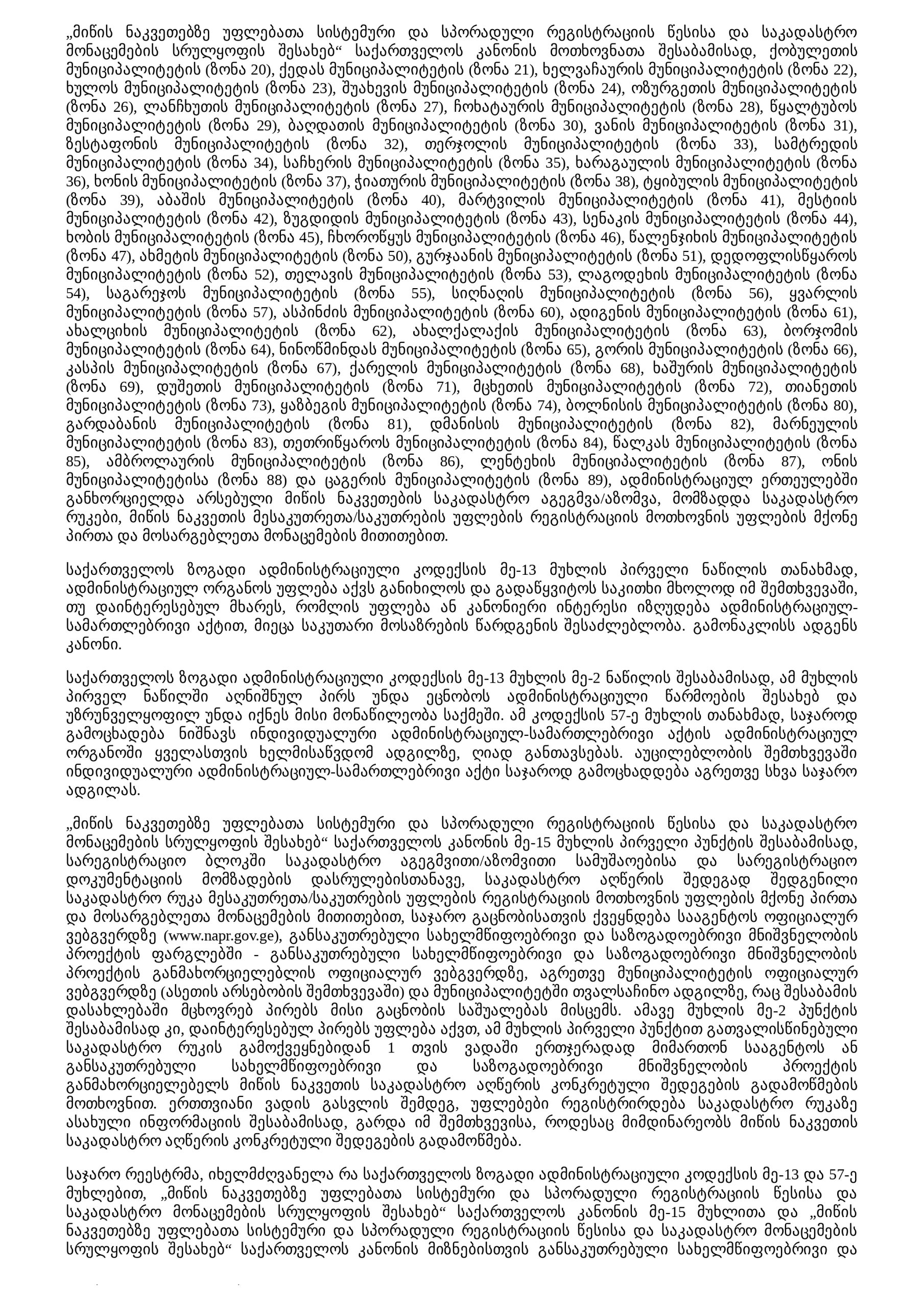 მერია ადმინისტრაციულ ერთეულებში მდებარე მიწის ნაკვეთებზე საკადასტრო აგეგმვითი/აზომვითი სამუშაოებისა და სარეგისტრაციო დოკუმენტაციის მომზადების საფუძველზე შედგენილი მესაკუთრეთა/საკუთრების უფლების რეგისტრაციის მოთხოვნის უფლების მქონე პირთა და მოსარგებლეთა მონაცემების მქონე საკადასტრო რუკის საჯარო გაცნობისათვის გამოქვეყნების შესახებ 15/12/2025